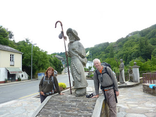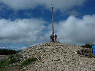Sotétben keltunk, a szállásunkor elfogyasztott reggeli után indultunk. A botokért visszakellett menni, mert ismét ottfelejtettuk. Volgyben vezetett az utunk, egyik oldalról autóút, a másik oldalunkon szép folyó folyt. Fenn a hegyekben sutott a nap, lenn a volgyben fáztunk, próbáltunk gyorsan haladni. Majd 20 km tettuk meg így, persze kis falukon is áthaladtunk, kerulgetve a tehénlepényeket. Trabadelo-ban ettunk egy szendvicset és innen eros emelkedo kovetkezett. Fák kozott kavicsos osvényen mentunk, sok zarándokkal találkoztunk. Szép volt az út, de fárasztó is. Megérkeztunk O Cebreiróba, alig találtuk meg az alberguet, nem volt kitáblázva de egy társunk megmutatta. Ez egy felújított szállás kb 200 fos lehet. Sikerult a tetoérbe kapni ágyat, ahol 8-an vagyunk, a tobbi termekben 60-80-an lehetnek. Pihenés után felmentunk a O Cebreiro hegyre, ahol egy nagy fakereszt áll, ahol a hagyomány szerint, míg a vaskeresztnél letettuk a terheket, addig itt azokat a kívánságokat lehet megfogalmazni ami a szívunkben él. Lesétáltunk a templomba ahol gyertyát gyújtottunk. O Cebreiro éttermekbol, szállásokból áll, de olyan magas hegy tetején áll, hogy teljesen korbelátni a korulotte lévo tájat, csodálatosan szép hegyeket. Az egyik étteremben zarándokmenut vacsoráztunk: leves vagy salátamix, sulthús krumplival, suti és egy uveg bor.