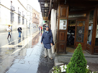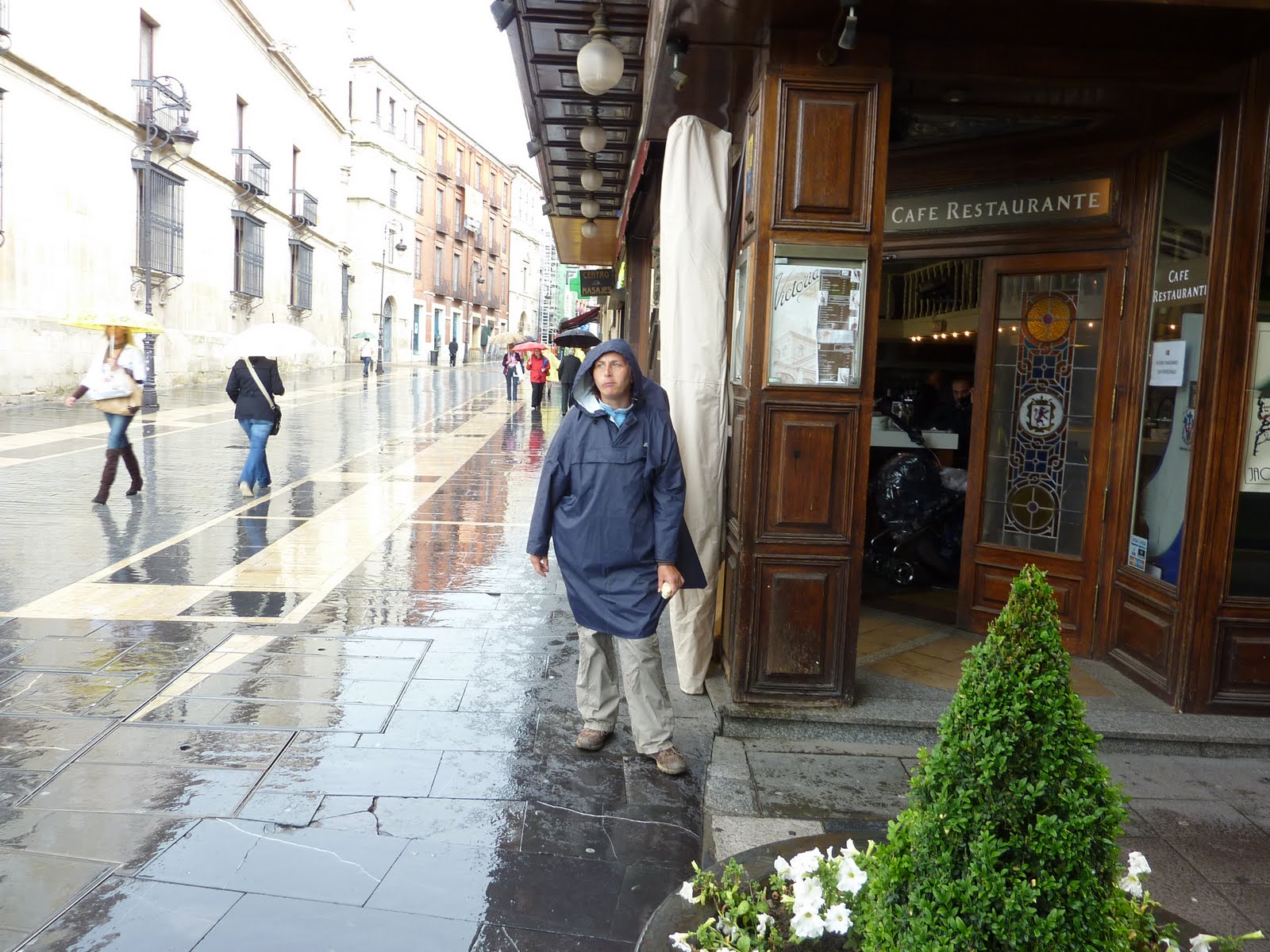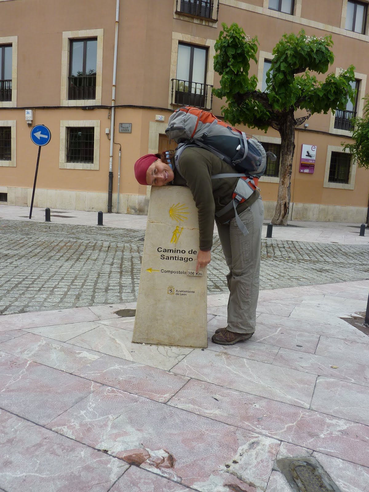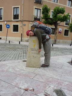 Reggel esoben indultunk, kozeli bárban reggeliztunk, egy helyi fiú megorult nekunk, elég hangosan tudtunkra is adta. Kedves volt megvendégelt egy kis sonka kostolással. Jó hangulatban indultunk tovább. Végig az autóút mellett haladtunk kerulgetve a nagy tócsákat. León elott egy hatalmas zivatar elkapott, nem volt hely ahova behúzódhattunk volna. Pár perc alatt mindenunk vizes lett. León lenyugozo nagyváros. Szép hatalmas tereivel, ódon hangulatú házaival. Megcsodáltuk a Bazilikát, bár csak 16-kor nyitották ki a kapukat és majdnem kétórát kellett várnunk rá. Megérte. Kozben megebédeltunk, és találkoztunk a Kanadai novel, és az Argentin fiúval, megorult nekunk. Városnézes után 6 km-ert gyalogoltunk szemerkélo esoben. Megérkeztunk szállásunkra, majd este sétáltunk a kellemes kulvárosban, megnéztuk a 12 apostol  hatalmas bronzszobrát, koztuk szent Jakab, amint Santiago felé néz.