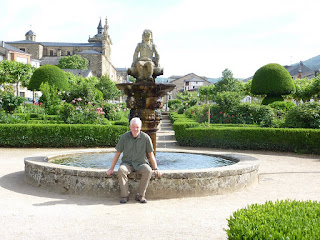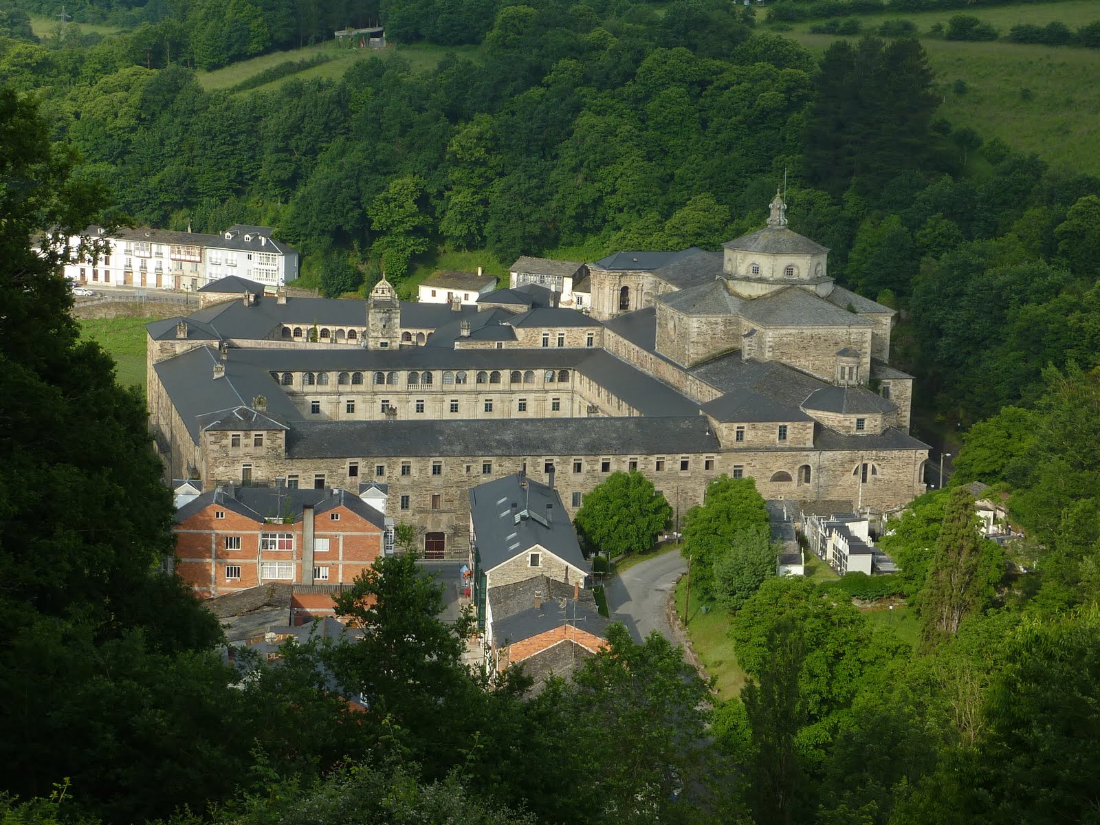 Korán indultunk, egy gépi kávét ittunk. Autóút mellett haladva egy folyó kisért megint. Árnyas utakon mentunk, míg beértunk Samos-ba, ahol a finom reggeli után megnéztuk a Benedekrendi kolostort. Spanyol idegenvezeto kisért végig, egy szót se értettunk, de amit láttunk az nagyon tetszett. A kolostorban a falakon, gyonyoru freskók voltak festve, a templomot eskuvore díszítették fehér virágokkal.