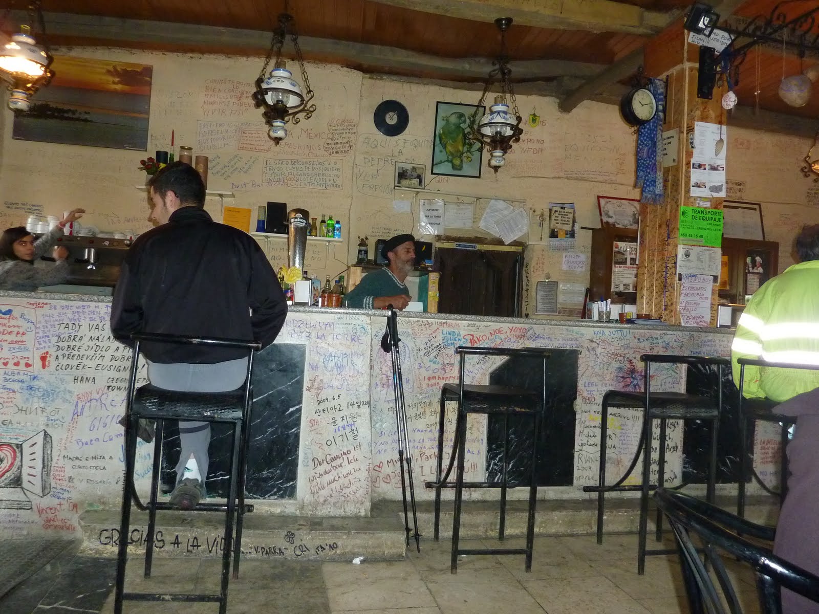 A szállásunkon reggeliztunk ma is esoben indultunk. A ruhánk a poncsó alatt hamar átázott. Az esot oldalról kaptuk heves széllel, és helyenként jéggel. Amennyire csak bírtunk gyorsan haladtunk. A ciponk is hamar megadta magát, teljesen beázott minden lépésnél nem csak a párát de a vízet is kiengedte. Reliegos-ba betértunk egy bárba ahol nagy orommel és elismeréssel fogadtak. Ma nem sok vándor járhatott erre. Míg ittuk a fórró kakaónkat nézegettuk a falra felírt szovegeket. Jó volt olvasgatni magyar zarándokok kedves uzeneteit. Igazi kuriózum a hely.